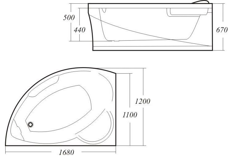 Размеры угловой ассиметричной акриловой ванны "Алари" составляют всего 168х120 см, благодаря чему она прекрасно подходит для помещений с небольшой площадью. При этом чаша имеет удобную плавную форму и достаточно большое внутреннее пространство.