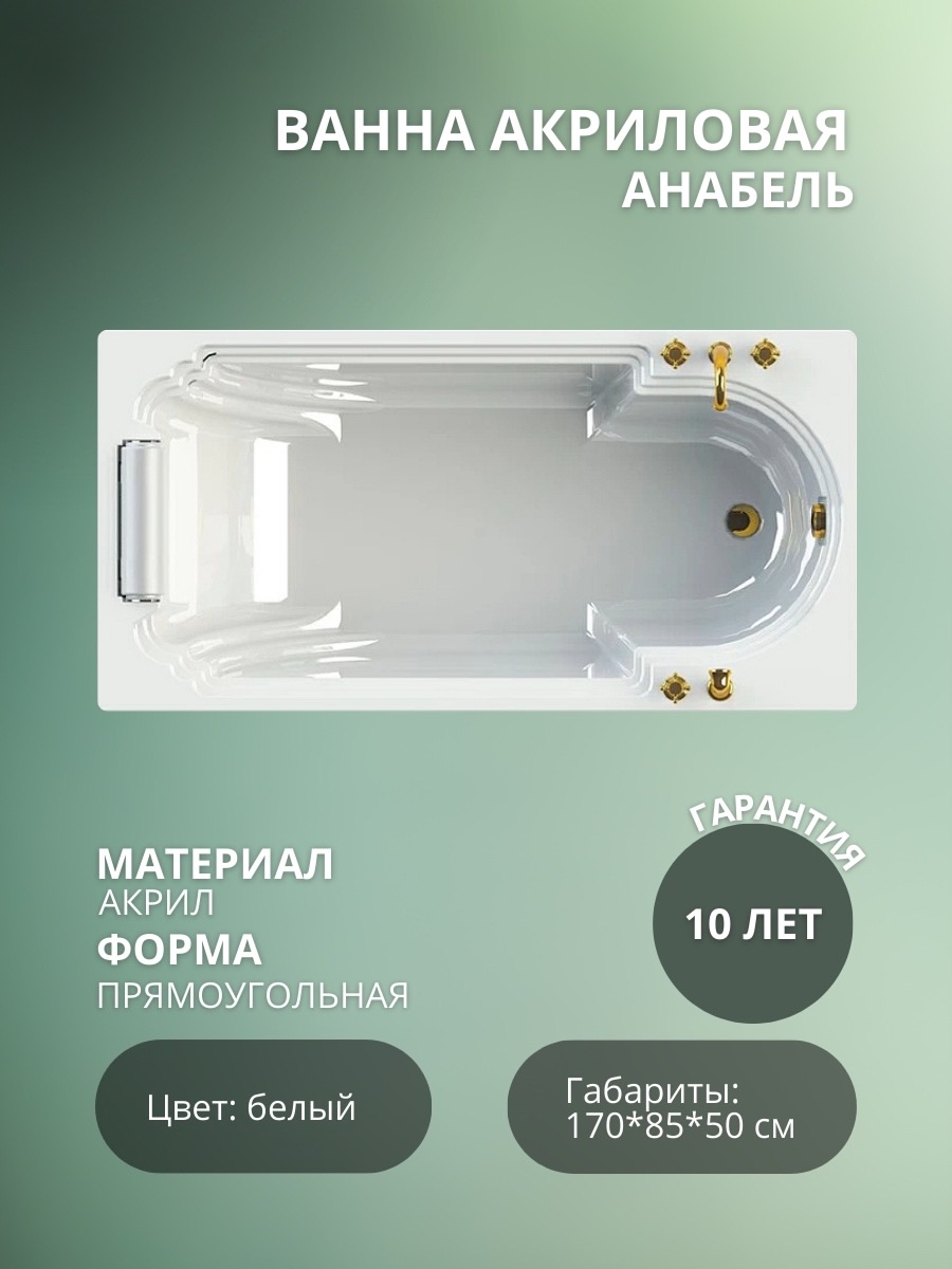 Акриловая ванна «Анабель» класса люкс собирается путем тщательной подборки каждой детали вручную. Чаша ванны из высококачественного сантехнического акрила обладает высокими антибактериальными свойствами.