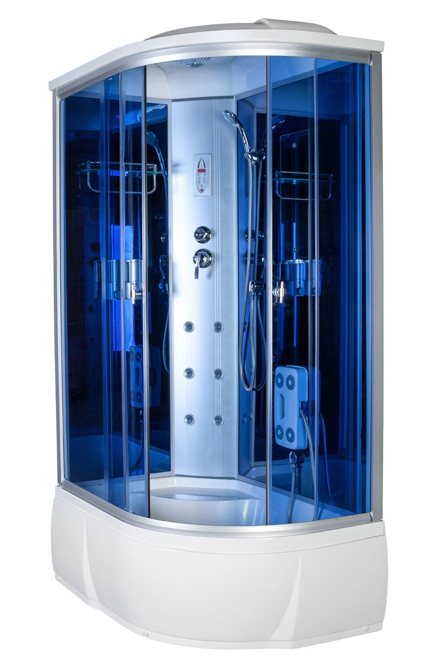 120×80×220см (голубое стекло, синие зеркальные задние стенки, пульт управления: вытяжка, радио, подсветка, гидромассаж спины - 6 форсунок, гидромассажер стоп, дозаторы для мыла, высокий поддон 40см. Левая) + поворотные двойные ролики, гидрозатвор, кнопочный слив с системой очистки, новая система сборки алюминия на защелках.