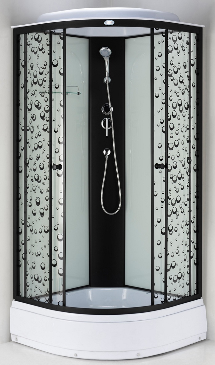Задние стекла белые, в металлическом каркасе чёрного цвета, передние стекла прозрачные с рисунком КАПЛИ, толщина стекол 4 миллиметра. Высота поддона 25 см, ПОДДОН С БОРТИКОМ. Чёрная панель, чёрный алюминиевый каркас.