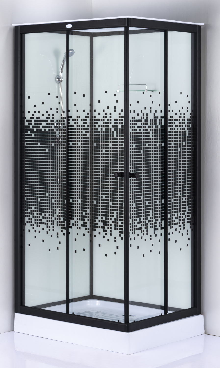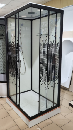 Задние стекла белые,в чёрном алюминиевым каркасе, толщина стекол 4 мм, передние стекла прозрачные с пикселями, высота поддона 13 см
