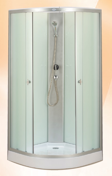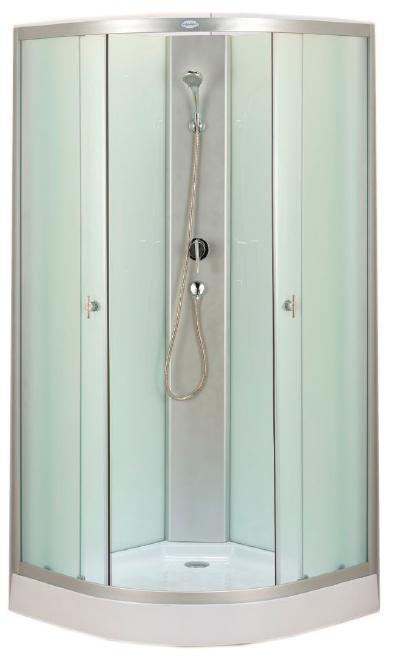 Передние стекла 4 мм матовые, задняя стенка 4 мм: белое стекло (без металооплетки), серебряный алюминиевый каркас, высота поддона 13 см, ручной душ с держателем, смеситель, без крыши, без электрики.Характеристики