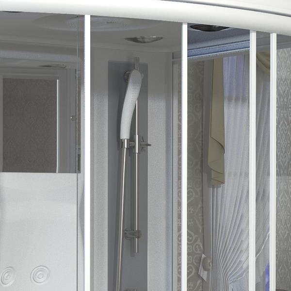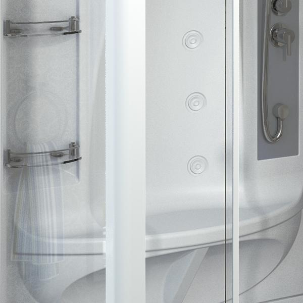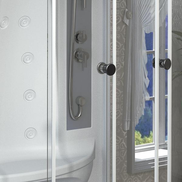 Душевая кабинка от производителя в Интернет магазине «Радомир» – это гарантированно высококлассное, надежное, долговечное и функциональное сантехническое оборудование, приобрести которое не составляет особого труда и усилий. Конструкция изделия состоит из акрилового поддона, прочного алюминиевого каркаса и закаленного стекла толщиной 6 мм. Все элементы кабинки экологически чистые и безопасные. Плотно смыкающиеся дверцы не позволяют воде распрыскиваться за пределы, а значит, берегут пол и прочие поверхности от чрезмерной влаги. Две стеклянные полки для банных принадлежностей и наличие зеркала внутри делают проведение водных процедур удобным и легким. Поддон душевой кабины «Диана-3» предусматривает 2 устройства слива, благодаря чему вода быстрее уходит во время принятия душа. При установке гидромассажных форсунок осуществляется качественная проработка мышц и приятный массаж тела.