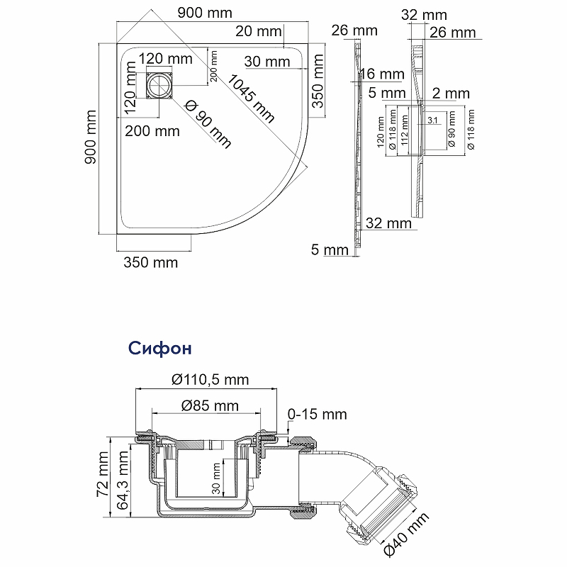 Сифон в поддоне имеет гидрозатвор, препятствующий появлению неприятных запахов из канализации.