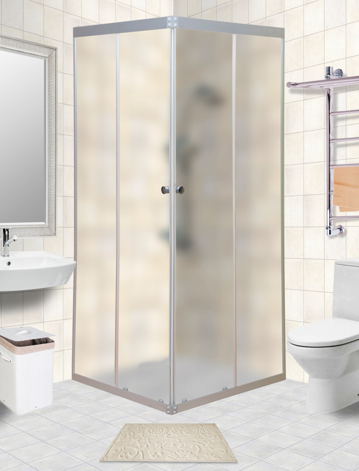 Уголок изготовлен из матового анодированного алюминиевого профиля серебристого цвета. Матовая поверхность профиля придает уголку привлекательный внешний вид. Стенки уголка выполнены из закаленного травмобезопасного матового стекла толщиной 4 мм. Механизм раздвижения створок работает на основе одинарных верхних и нижних роликов. Магнитная лента плотно фиксирует стеклянные двери в закрытом положении, создавая надежный барьер от брызг, оставляя ванную комнату сухой.