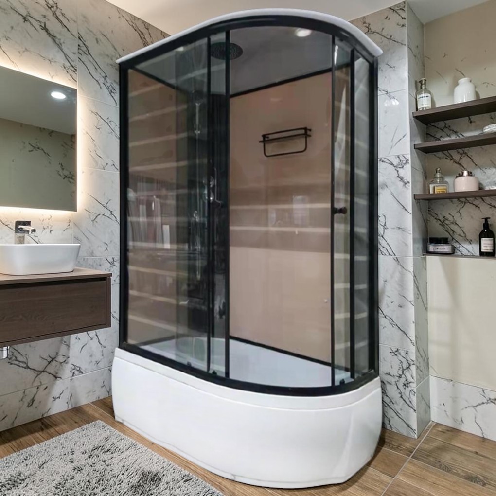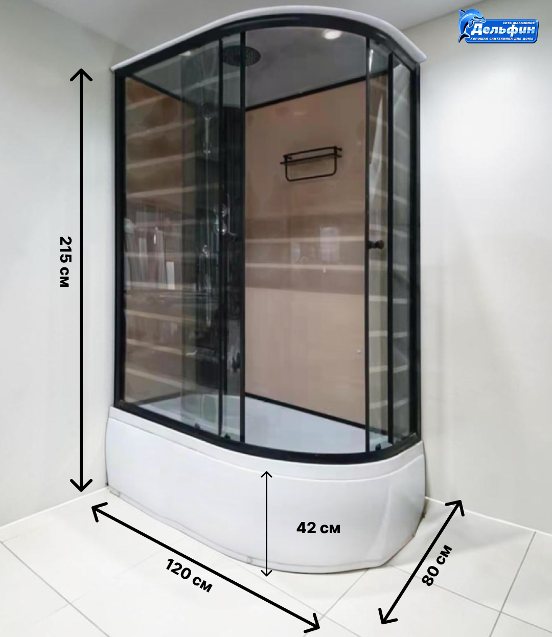 Душевая кабина Дана 54 L (120x80x215 см) в черном профиле, с крышей, с высоким поддоном (42 см) - это идеальное решение для вашей современной ванной комнаты! С размером 120*80*215, она обеспечивает достаточное пространство для комфортного и расслабляющего душа.