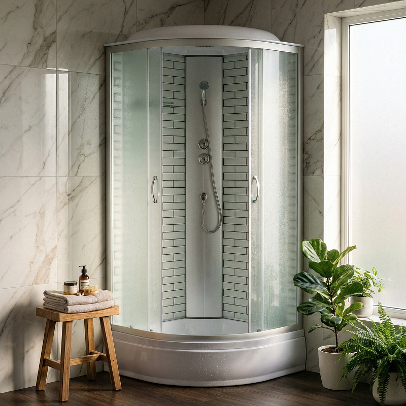 Современная угловая кабина с усиленной конструкцией, средним поддоном 25 см и дизайнерским решением — идеальный выбор для тех, кто ценит надёжность и эстетику.