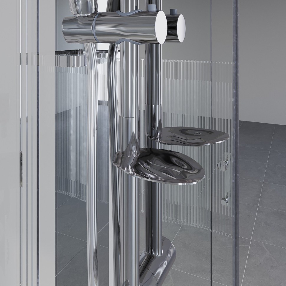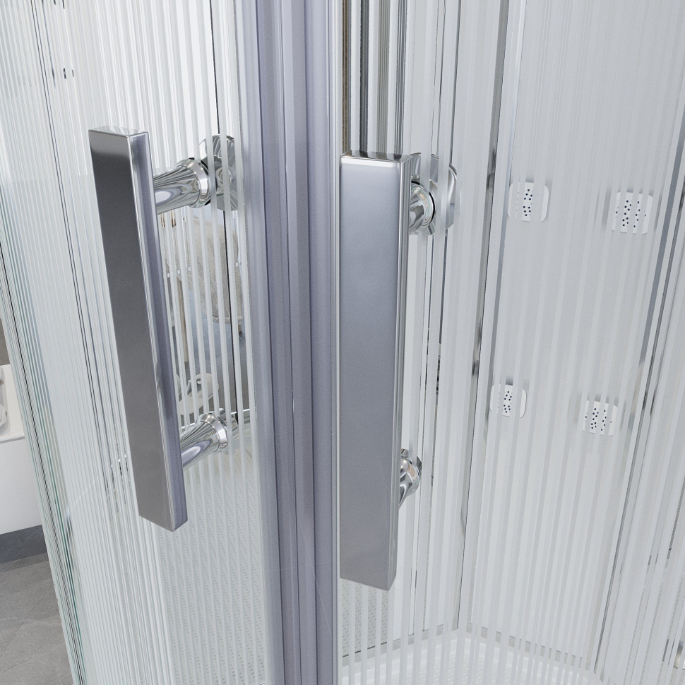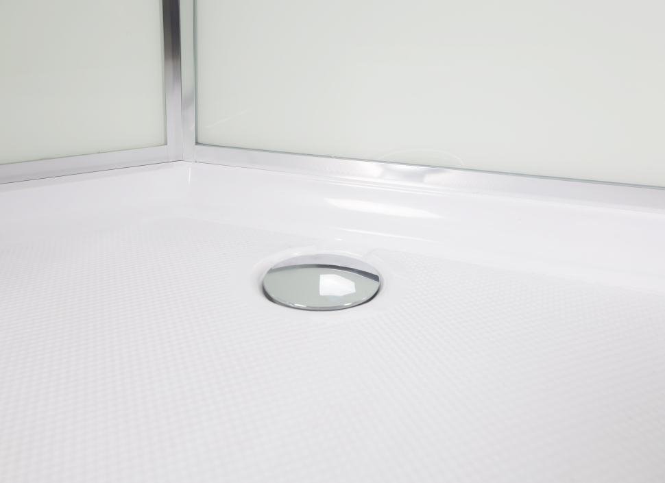 Передние неподвижные стенки и двери: закалённое стекло, прозрачное, с матовой полосой.