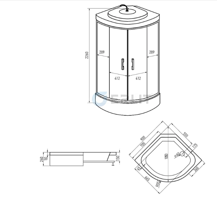 Форма поддона и ограждения — четверть круга, идеально подходит для углового монтажа.