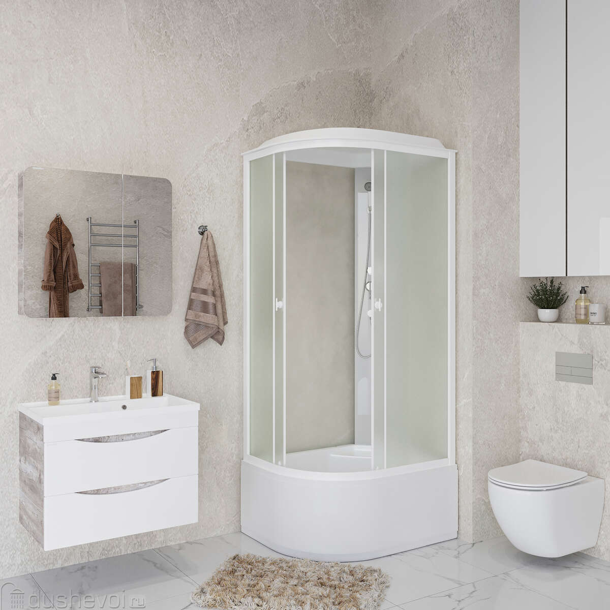 Эта модель представляет собой закрытую душевую кабину, которая обеспечивает полную приватность и эффективно удерживает тепло внутри, создавая эффект парной.
