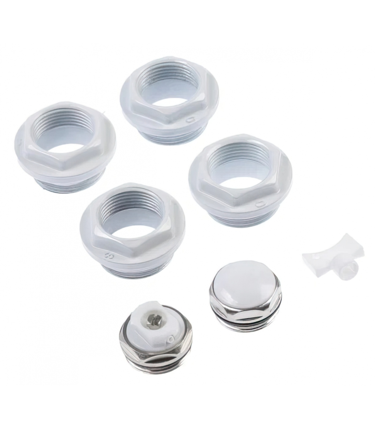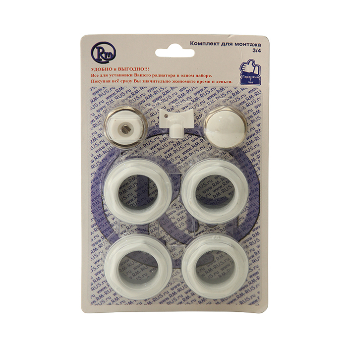 Комплекты для монтажа радиаторов предназначены для монтажа алюминиевых и биметаллических радиаторов с присоединительным размером верхнего и нижнего коллекторов 1 дюйм (внутренняя резьба). В состав комплекта включены четыре футорки 1x3/4 дюйма – две правые и две левые. Футорки снабжены силиконовыми прокладками. Также в комплект включены пробка для футорки, ручной самоуплотняющийся воздухоотводчик, ключ для воздухоотводчика. Футорки, выполнены из оцинкованной стали, окрашены белой эпоксидной эмалью.