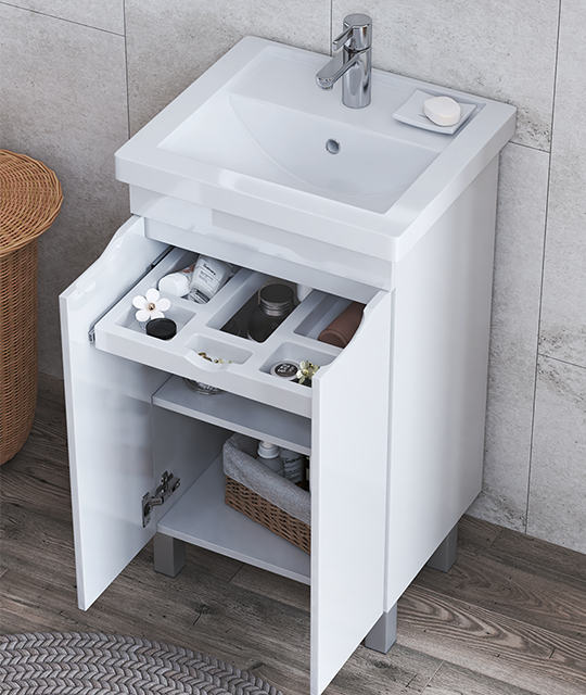 Оснащение: 2 дверцы, 1 полка ЛДСП; органайзер для мелочей; опоры квадратные регулируемые.