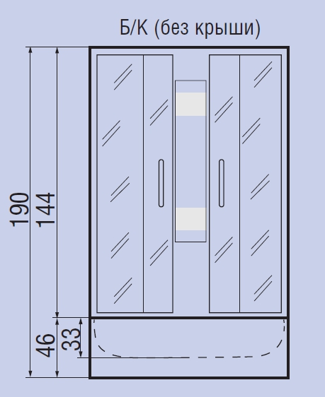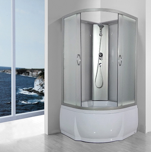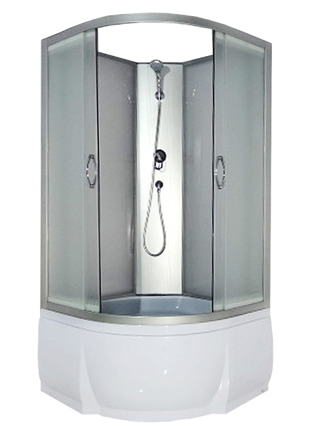 КОМПЛЕКТАЦИЯ: без крыши, цент. стойка, ручной душ 3-х позиц., держатель для лейки, смеситель, полочка, смеситель, сиденье, поддон п/кр. выс. со/съем экр. (Н=46 см), сифон. ПЕРЕДНЯЯ ЧАСТЬ - Матовое стекло, профиль матовый хром. ЗАДНЯЯ СТЕНКА - Матовое стекло