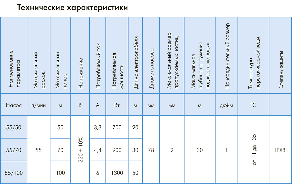Насос «ВОДОМЕТ 3Д» 55/100 предназначен для подачи чистой воды из скважин, колодцев и других источников. Обладает максимальным расходом 55 литров в минуту и максимальным напором 100 метров. Подходит для комплектации систем автоматизированного водоснабжения дома, полива и орошения. Способен перекачивать воду с содержанием песка во взвешенном состоянии до 2 килограмм на кубический метр воды. Электродвигатель насоса надежно защищен от перегрева потоком омывающей его воды, что позволяет насосу работать не полностью погруженным в воду.