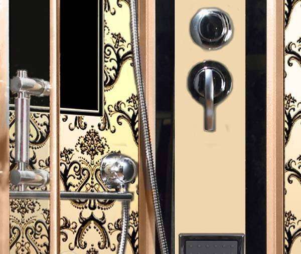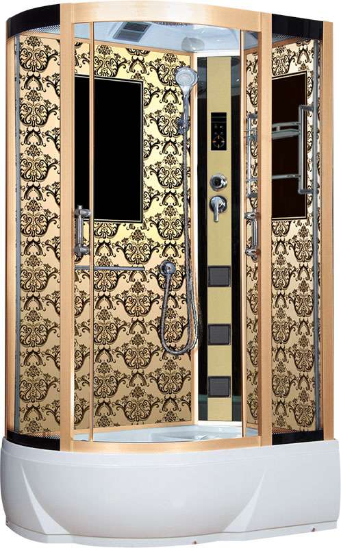 Закрытая душевая кабина Niagara NG-7712GR, 80х120х215 см, без пара, c гидромассажем, прямоугольной асимметричной формы . Особенности душевой кабины: алюминиевый профиль цвета "матовый хром"; цвет задних стёкол- " золото c рисунком", фронтальные стёкла - прозрачные, толщина стекла -5 мм; двухсекционные раздвижные двери; 3 форсунки для бокового гидромассажа; тропический душ; 3-позиционная душевая лейка; электронный пульт управления; FM-радио; вытяжной вентилятор; полочки для душевых принадлежностей; 2 зеркала; сиденье, встроенное в поддон; дозатор для жидкого мыла; сифон с гофрой. Высота белого акрилового поддона - 39 см. Ориентация душевой кабины - правая.