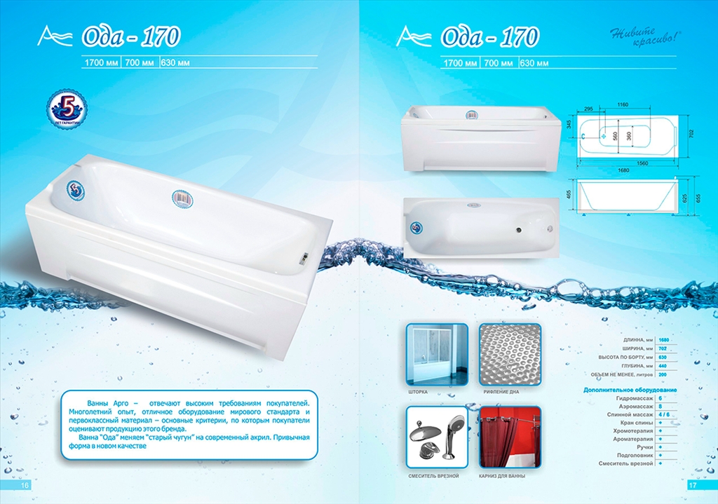 Акриловая ванна «ОДА» 1700х700х630 мм - классическая прямоугольная. 5 мм толщина акрила, армированы стекловолокном с полиэфирной смолой, срок гарантии 10 лет, белоснежно белый цвет ванны.