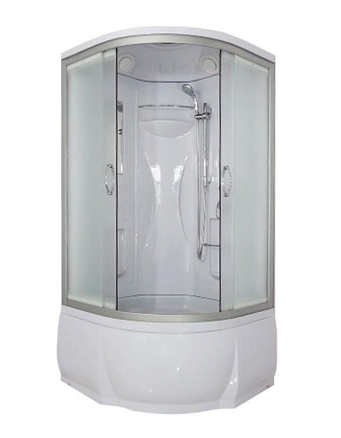 Закрытая душевая кабина с раздвижными дверьми, оборудованная системой тропического душа. Стекла закаленные, травмобезопасные, матовые, толщиной 4 мм. Профиль матовый хром. Задняя стенка цельная акриловая со встроенными полочками и сиденьем. Поддон высокий 43 см на металлическом каркасе, со съемным экраном и сифоном.