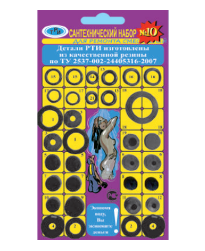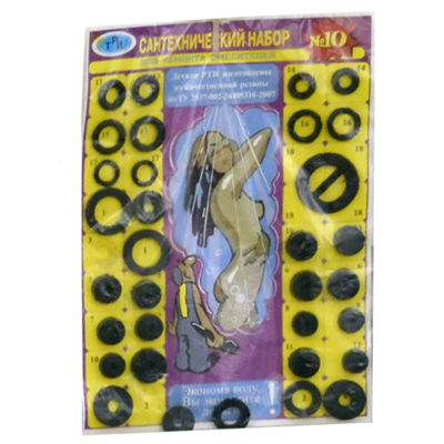 Универсальный набор, состоящий из колец, прокладок и клапанов, предназначенных для установки в отечественные и импортные смесители, вентили, гибкие подводки, кран-буксы различной модификации. Набор сосотоит из 33 изделия (21 вид).
