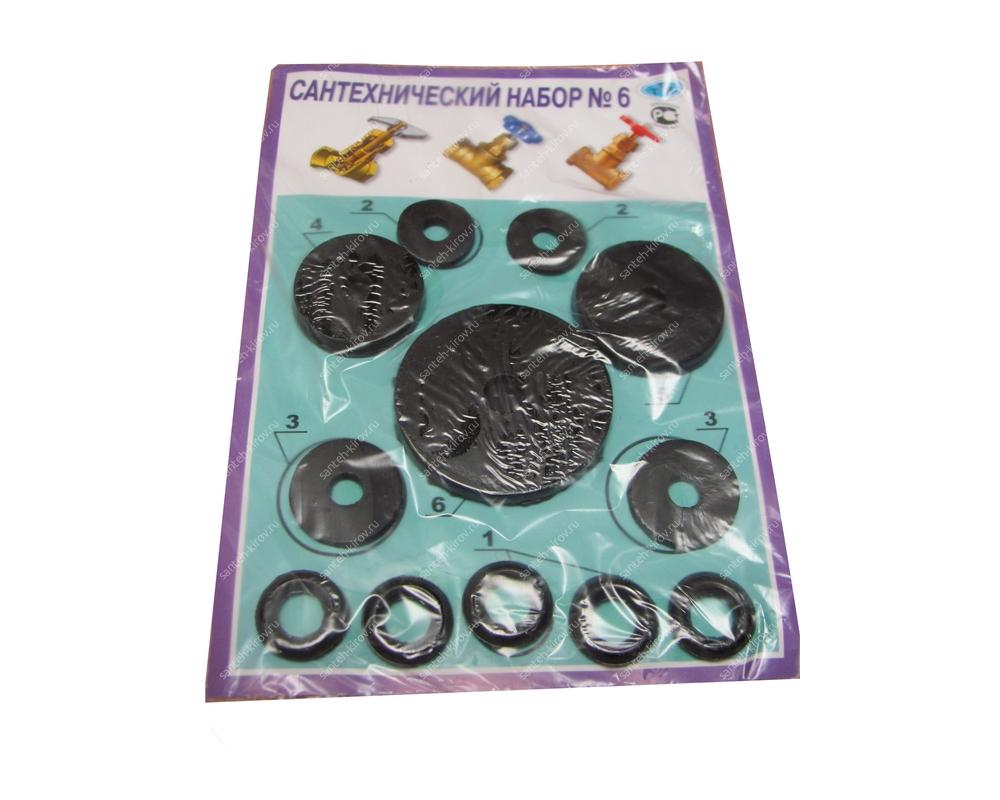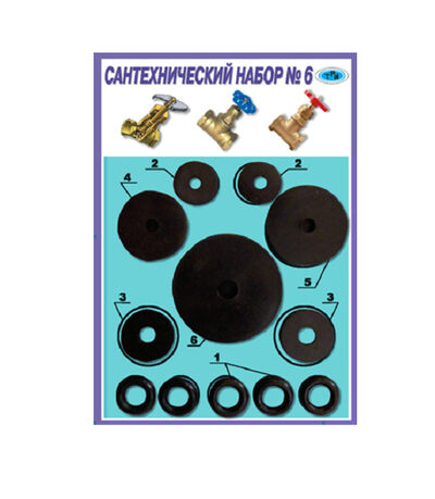 Набор №6 предназначен для ремонта вентилей ДУ15 — ДУ40. Набор состоит из 12 изделий (6 видов). Ремонтный набор №6 «Прокладки сантехнические» (12 шт).Универсальный набор, состоящий из колец, прокладок и клапанов. Предназначен для ремонта и установки в отечественные и импортные смесители, вентилей, гибких подводок, водяных счетчиков и кран-букс различной модификации.
