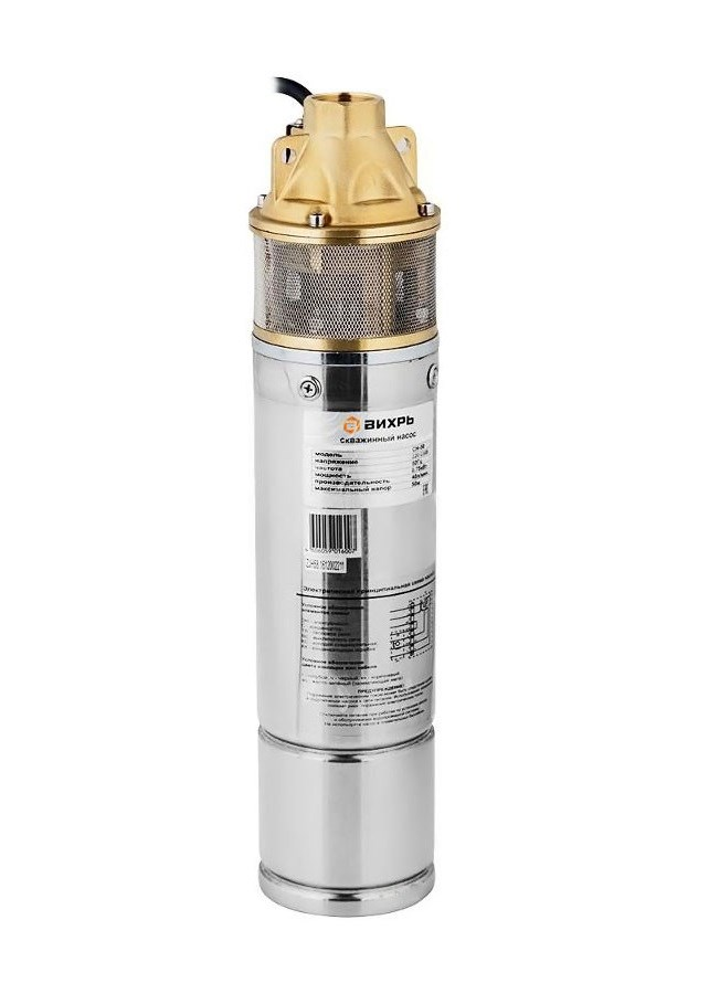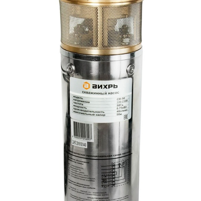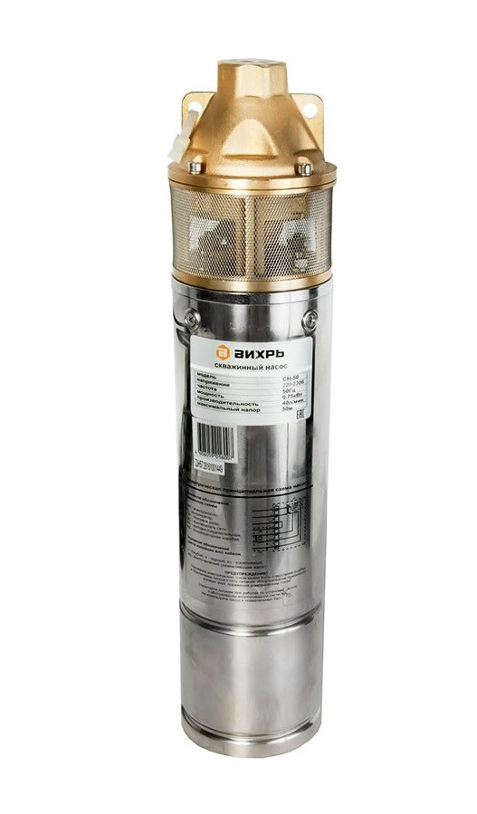 Скважинный насос Вихрь СН-50 предназначен для подачи воды в бытовых условиях из скважин, могут использоваться также для подачи воды из шахтных колодцев, резервуаров и открытых водоемов для полива садов и огородов. По степени защиты от поражения электрическим током электронасос относится к погружным насосам класса IPX8 и может работать полностью погруженным в воду на глубину до 40 метров. При этом расстояние от дна скважины до насоса не должно быть менее 0,6 метра. Насос СН-50 относится к вихревому типу, основным его преимуществом является создание высокого давления при малой подаче воды, поэтому насос лучше всего использовать для подачи воды из малодебитных скважин.