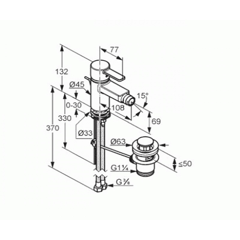 Каскадный аэратор на шаровом шарнире M 24 x 1, литой рычаг, керамический картридж с ограничителем горячей воды, донный клапан G 1 1/4, система быстрого монтажа, гибкая подводка G 3/8Характеристики