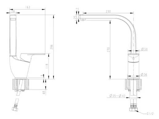 Оригинальный смеситель необычной формы выполнен из латуни с хромированным покрытием. Высокий излив снабжен поворотным механизмом вращения. Рычаг управления расположен непосредственно на корпусе смесителя, благодаря чему вся конструкция очень компактна и для монтажа требует всего лишь одно отверстие.