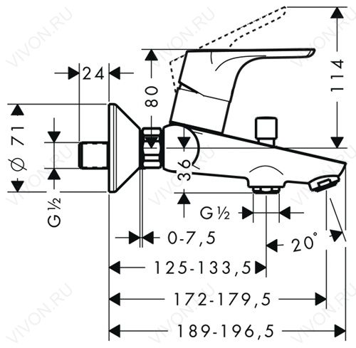 Излив: Длинный излив (179,5 мм) обеспечивает комфортное наполнение ванны.