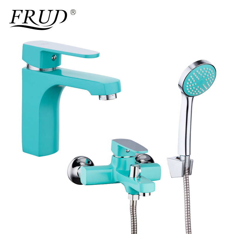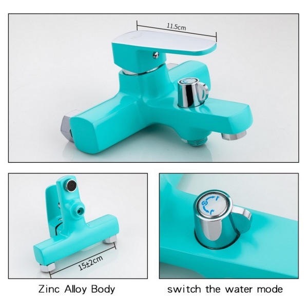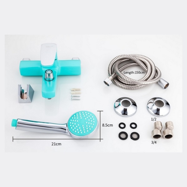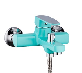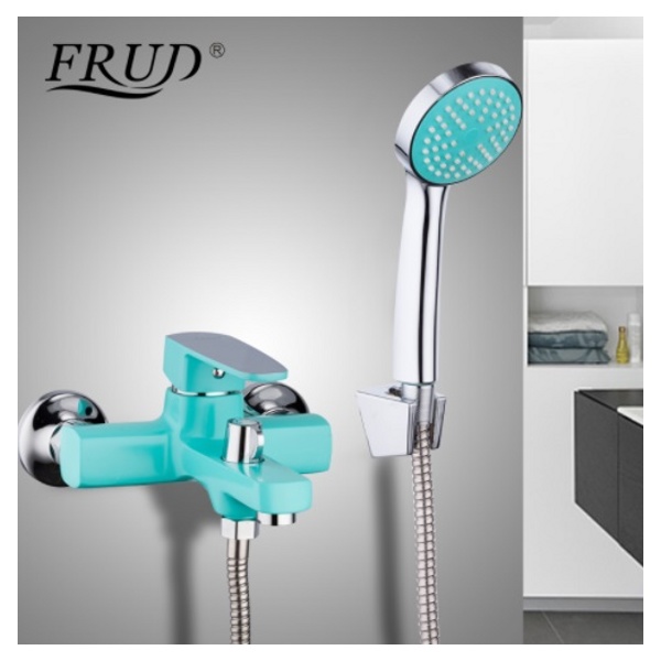 Frud смеситель для ванны, излив короткий, не поворотный, однорычажный, керамический катридж 35mm, переключение на душ в корпусе поворотное 90 градусов, комплектующие( эксцентрики,чашечки , прокладки, душевой шланг 1,5 м, душевая лейка без режимов, кронштейн на стену для лейки) цвет бирюзовый с хромом, корпус силуминовый
