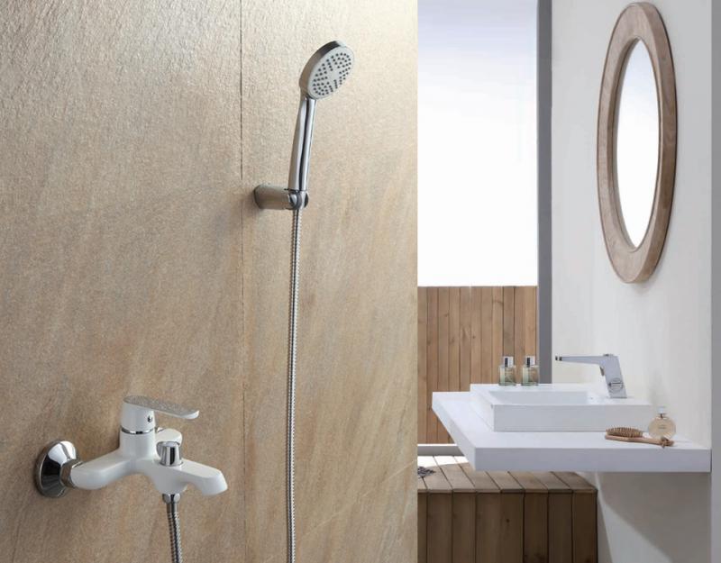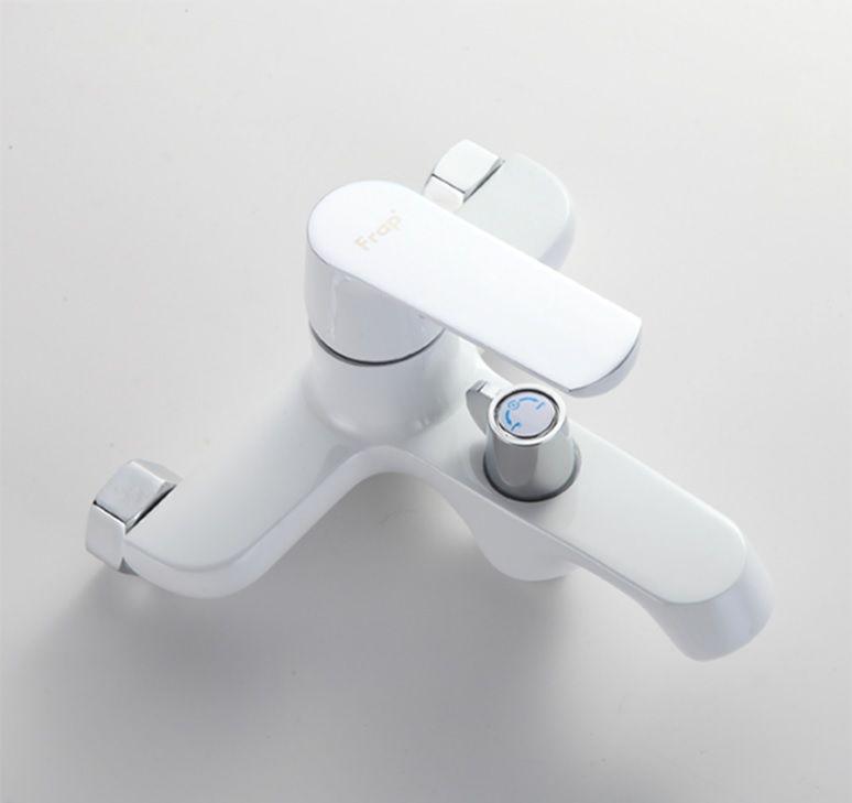 Frap смеситель для ванны, излив короткий, не поворотный, однорычажный, керамический катридж 35mm, переключение на душ в корпусе поворотное 120 градусов, комплектующие( эксцентрики, чашечки, прокладки, душевой шланг 1,5 м, душевая лейка , кронштейн для лейки) цвет белый, корпус латунный.