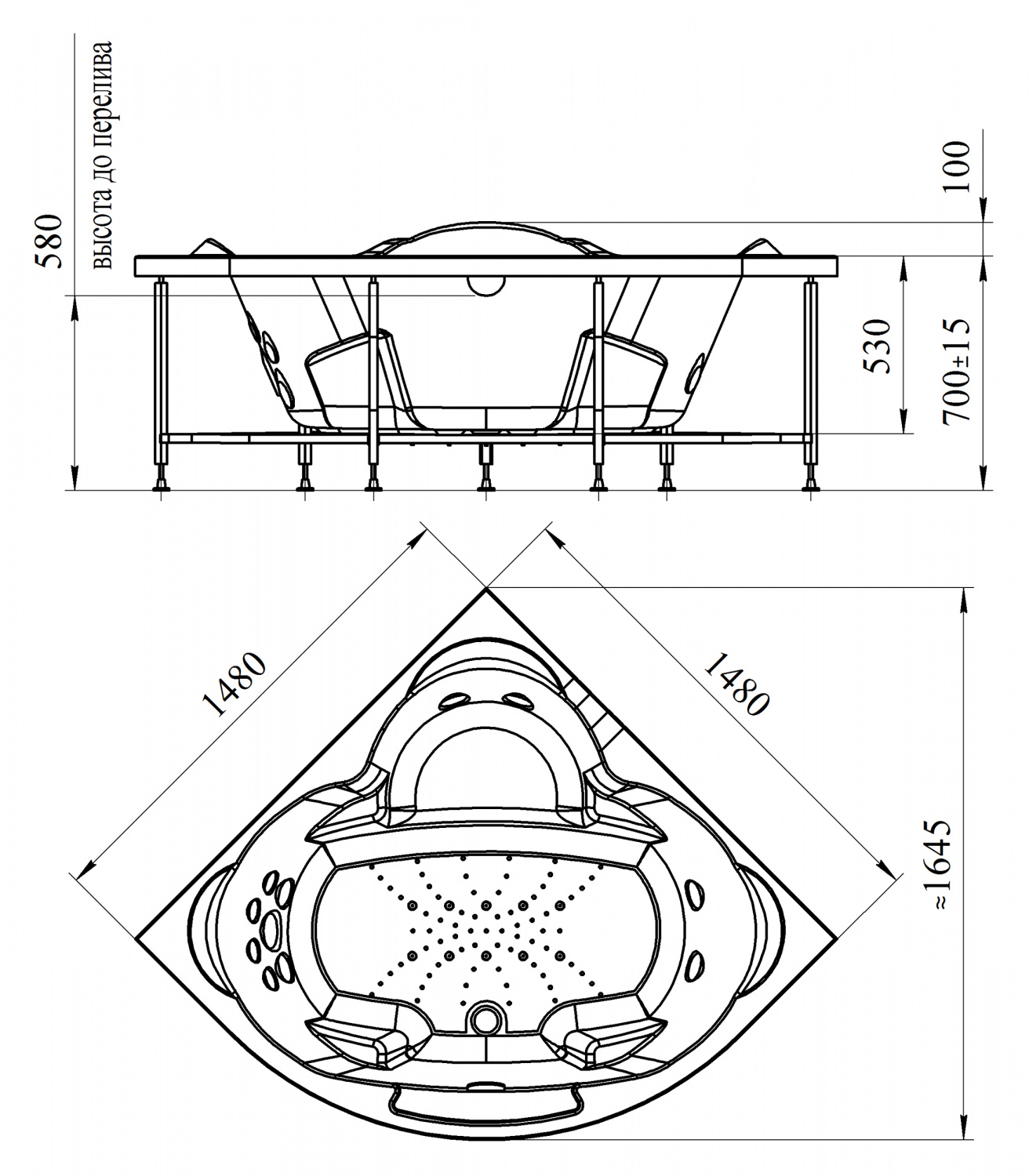 СОРРЕНТО ванна 1480*1480 рама-подставка+слив-перелив+фронт.панель