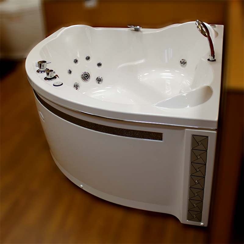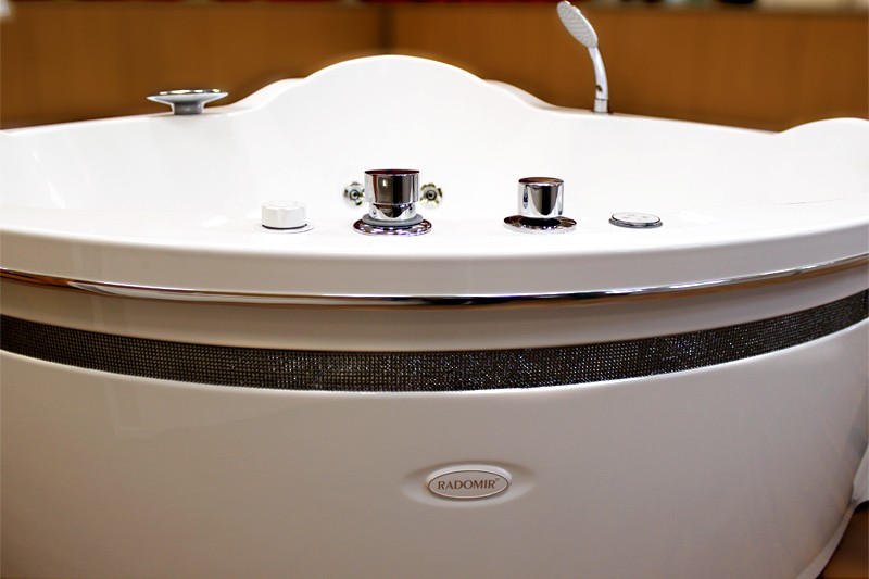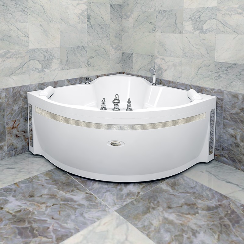 Собранная ванна на раме-подставке со сливом-переливом (полуавтомат), фронтальная панель с горизонтальной декоративной вставкой "Кристаллы Swarovski" и вертикальными декоративными вставками "Арт-мозаика", 6 форсунок "Jeremiah-LUXE" по периметру, 2 форсунки "Jeremiah-LUXE" для ног, 7 форсунок спинного массажа (1 "Вентура" + 2 "Jeremiah-LUXE" + 4 "Glory-WHITE"), контроллер 200, молдинг