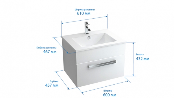 Тумба "НИКА 62" 1 ящ. белая подвесная с раковиной 825 А 600(плоский) ТРИТОН