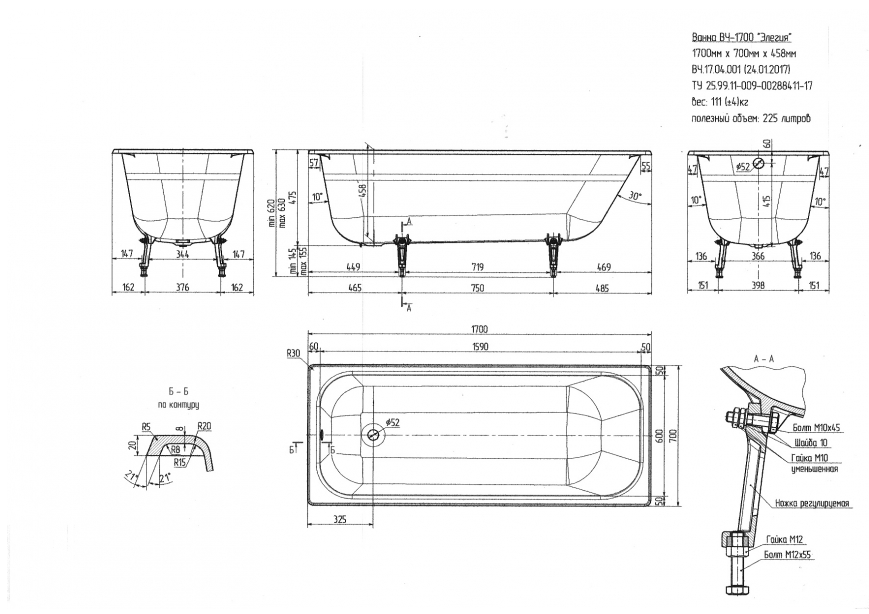 Ванна чугунная Элегия 170*70 с ножками г.Новокузнецк