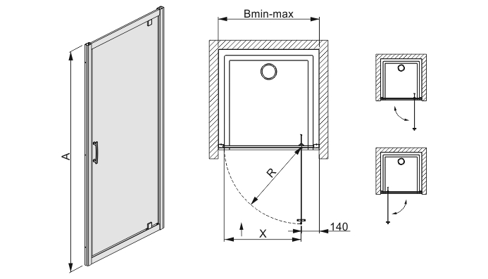 Распашная однодверная дверь для душа в полном каркасе, на вертикальных петлях