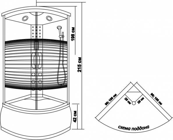 Длина 90 Ширина 90 Высота 215 Глубина 0.5 Производитель Водный мир Цвет Белый Ориентация Угловая Форма Четверть круга Гарантия 1 Крыша Да Сиденье Да Высота поддона 42 -