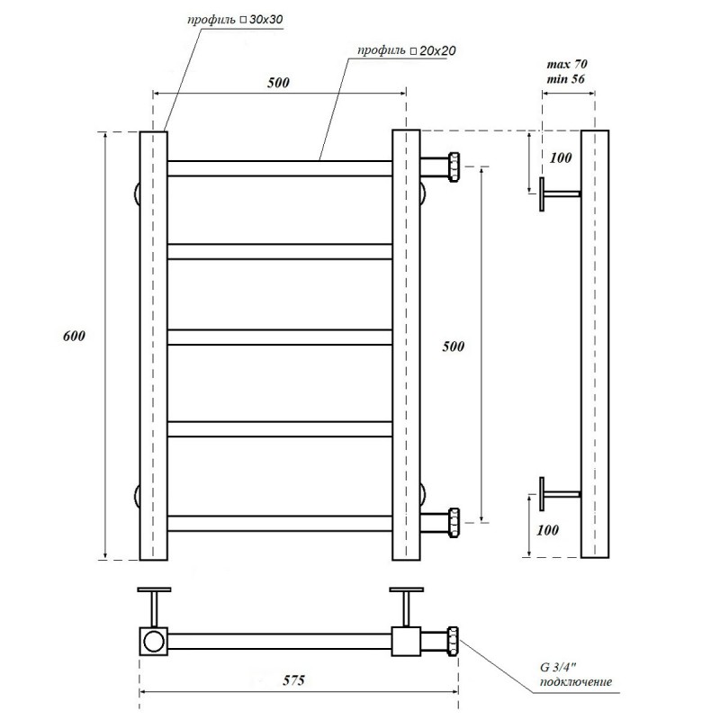 Полотенцесушитель Вега Point PN71556B П5 500*600 водяной, с бок.подкл, черный