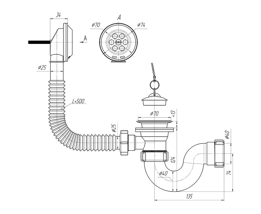 Подходит для ванн с отверстием слива D 50 мм и отверстием перелива от 36 до 63 мм (стандартное отверстие 50 мм). Так же подходит для ванн толщиной до 20 мм, в том числе для чугунных производства СССР (толщина 7-10 мм).